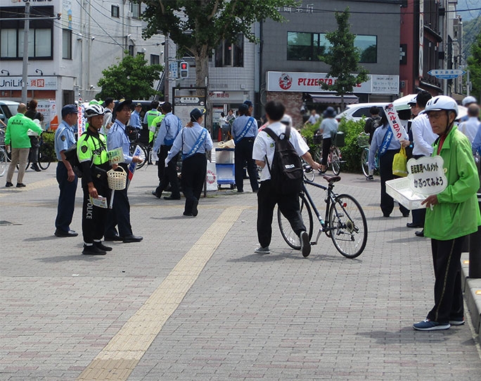 川端交通安全協会と下鴨交通安全協会は共同で、5月23日(金)、川端警察署や下鴨警察署などの関係機関と共に、今出川通東大路交差点で、今出川通の自転車の安全利用を呼び掛ける「今出川通作戦」を実施しました。