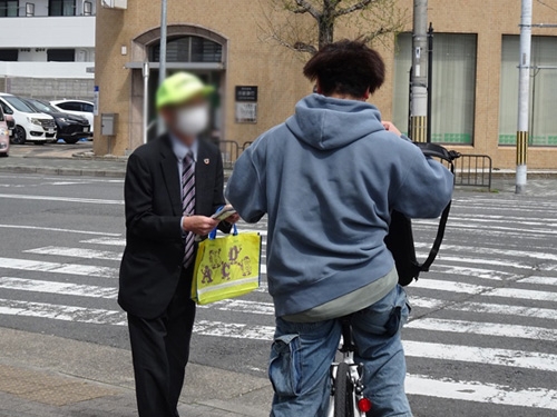 横断幕を掲げて「春の全国交通安全運動」をアピールしたり、通行される方にチラシと反射材をお渡しして、反射材を活用した事故防止をお願いしました。
