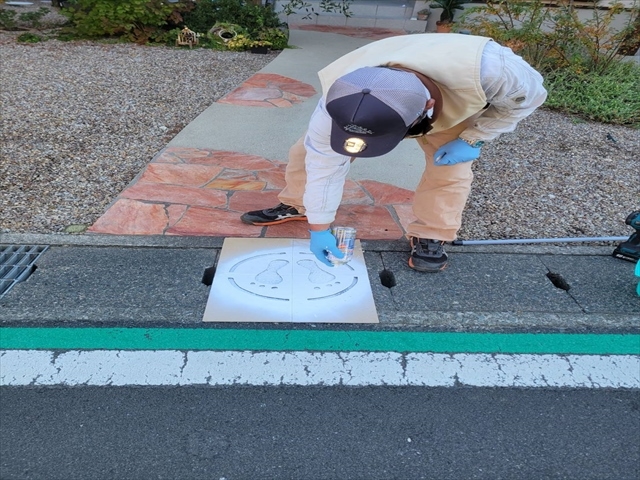 清掃後は、スプレーを使用して、路面に足跡マークを付けました。