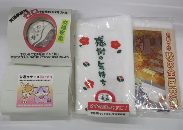 会社前の道路を通行するドライバーの方々に停まっていただいて、「死亡事故ゼロ」に合わせて数字のゼロに見立てた「ピンと餅」と呼ばれる宮津の名物和菓子や交通安全グッズ、チラシのセットをお渡ししながら、秋の全国交通安全運動と「交通事故死ゼロを目指す日」の周知や交通事故防止を呼び掛けました。