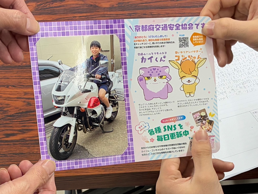 最後には、白バイと記念撮影をして、京都府交通安全協会のマスコットキャラクター「カイくん・コンちゃん」の写真立てに入れてプレゼントしました。