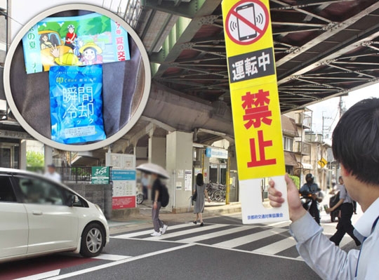 乙訓交通安全協会は、7月21日(月)から30日(水)の期間、向日町警察署などの関係機関と共に、夏の交通事故防止府民運動に合わせた啓発活動を行いました。