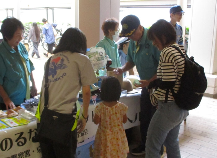 下鴨交通安全協会は9月27日(土)、下鴨警察署などの関係機関と共に、洛北阪急スクエアのウエルカムテラスで、自転車に乗る時のヘルメット着用推進活動を行いました。