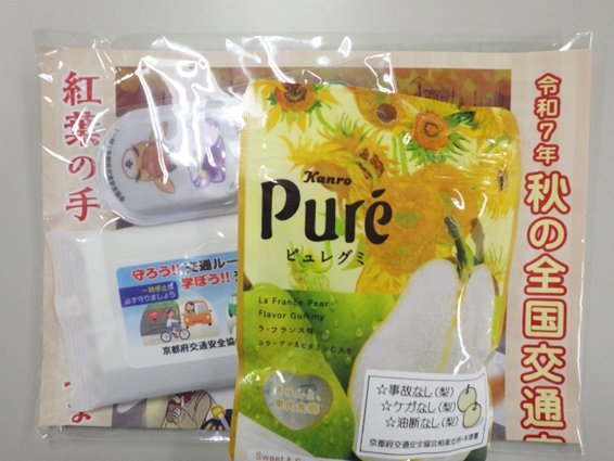 相楽交通安全協会は、9月20日(水)、和束運輸株式会社などの関係機関と共に、ローソン笠置切山店で、秋の全国交通安全運動の開始に合わせた交通安全啓発イベント「事故は無し(梨)作戦」を行いました。