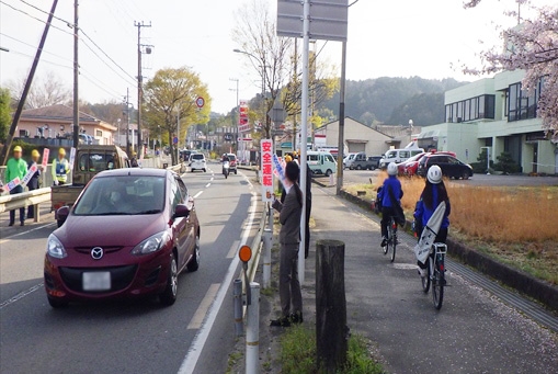 綴喜交通安全協会は、4月6日(月)、「春の全国交通安全運動」の実施に伴い、JR松井山手駅やJA京都やましろ宇治茶の郷などの主要所で、交通事故防止を呼び掛けました。