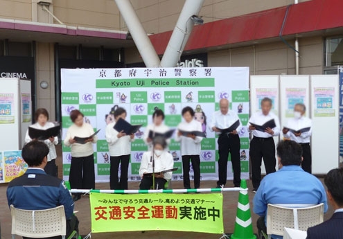 その後、久御山町の老人福祉センター「荒見苑」のコーラスサークルの方々による歌の披露や京都府立東宇治高等学校の1年生から成る「命守り隊」の皆さんが制作した交通安全かるたの発表があり、買い物に訪れた方々の興味を引いて、多くの方々に春の全国交通安全運動をアピールしていただきました!