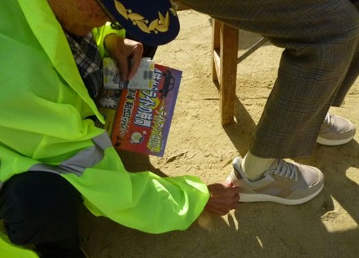 また、許可を頂いた方には直接靴のかかとに反射材シールを靴に貼って、夜間の交通事故防止を呼び掛けました。