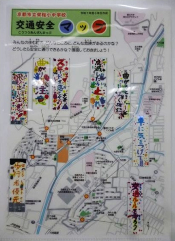 山科交通安全協会は、12月18日(木)、山科警察署などの関係機関と共に、京都市立栄桜小中学校で、同校の3年生がデザインした交通安全電柱幕の絵柄のお披露目式を行いました。