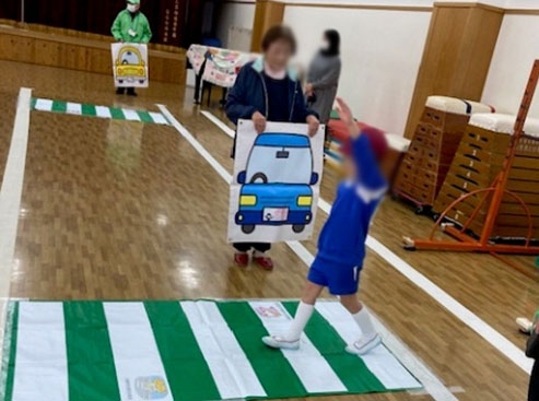 その後、室内に白線と横断マットで作った模擬道路で、実際に合図横断で道路を渡る練習を行いました。