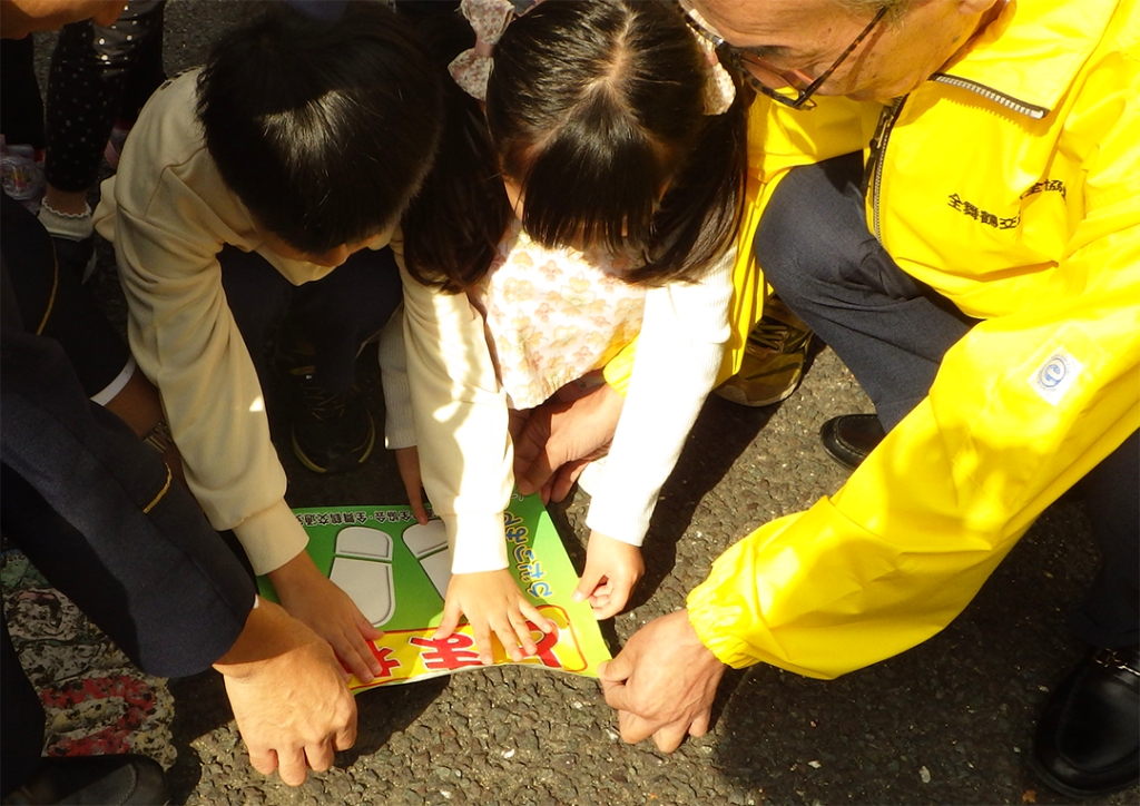 その後、全舞鶴交通安全協会長からストップシールの贈呈を行い、園児の皆さんと一緒に園の入り口に貼り付けました。