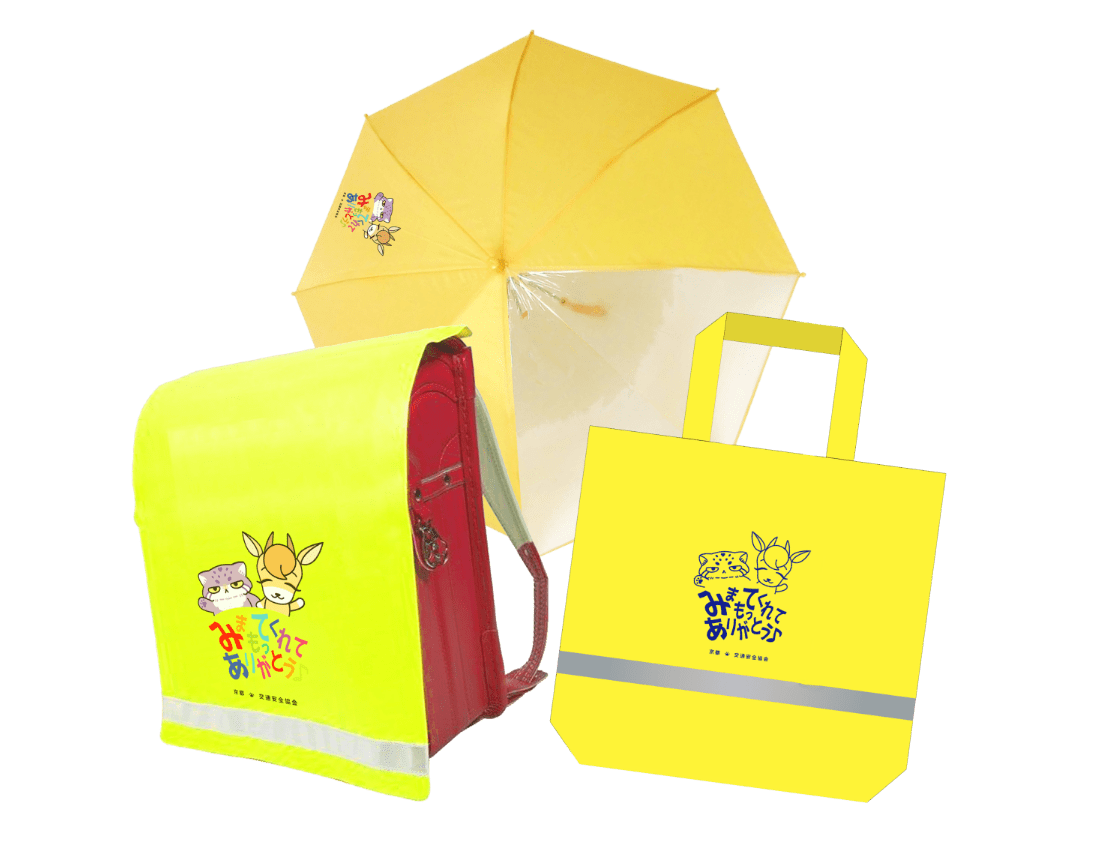 新小学1年生を対象に、運転手から見てよく分かる黄色を使ったランドセルカバー・傘・手提げバッグを、学校の希望に合わせて贈呈しています。