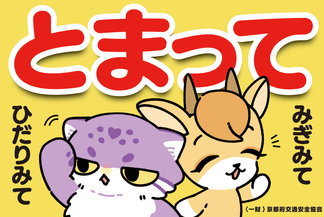 こどもの飛び出しによる交通事故を防ぐための「交通安全ストップシール」を製作し、京都府内の小学校や保育園・幼稚園、こども達の多く集まる京都市動物園に配布して、各校の校門や出入口に貼ってもらっています。