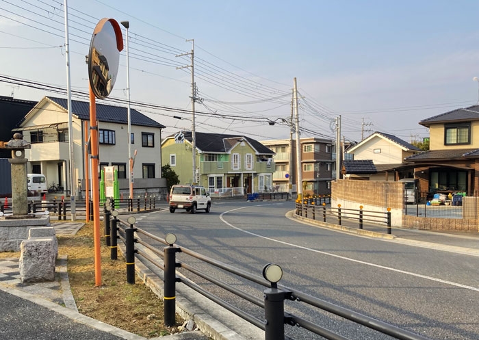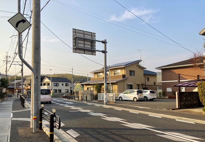 この街道は、向日丘陵と呼ばれるなだらかな丘陵の裾に沿う形で大きくカーブをしている場所がいくつかありますので、自動車や二輪車で走行する際には、前方の確認やスピードに十分注意して通行してください。