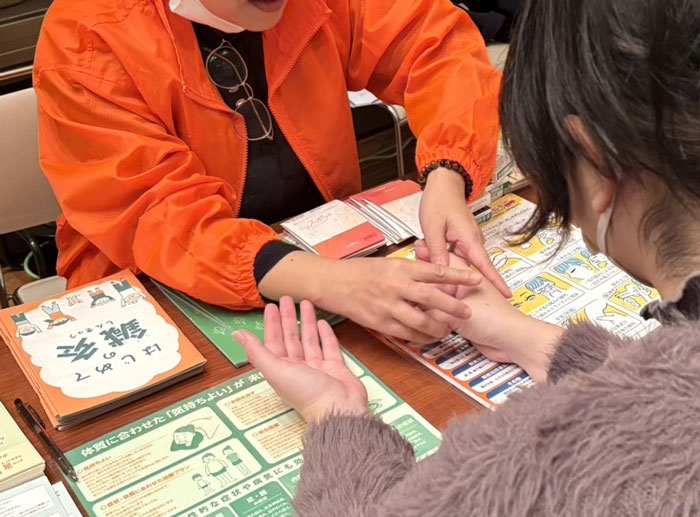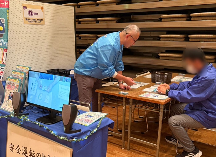 京都府鍼灸師会様による、安全に運転していただくための、疲労回復や疲れ目改善に繋がるツボの紹介や痛くない「シール鍼」を使ったツボ押し体験をしていただきました。