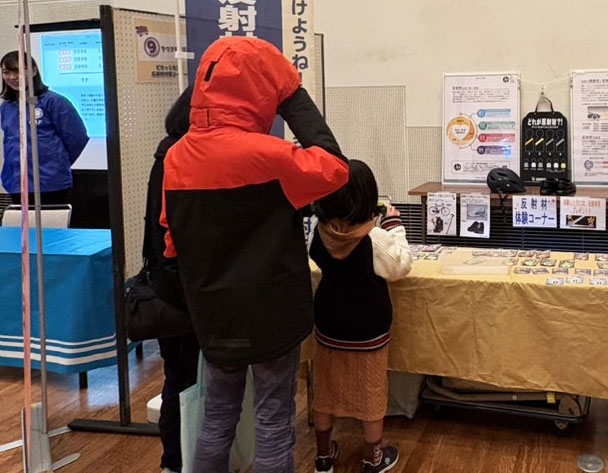 (株)ヤマグチ工芸社様による、様々な反射材の商品展示と車のライトが当たった時の反射材の光り方を体験してもらいました。