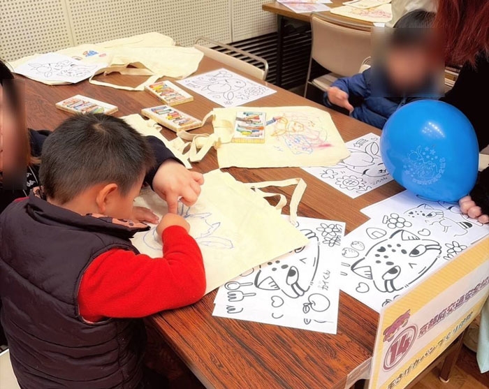 下絵をなぞってカイくん・コンちゃんを描いたり、自分の好きな絵を描いて、世界に一つだけのトートバックをつくってもらいました✨