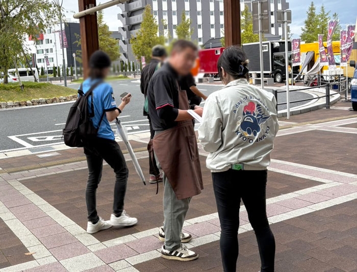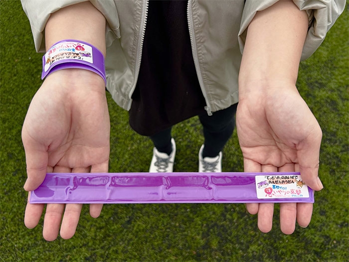 また、広場の周辺では、地域の皆さんや試合を観戦しに集まられた方々に、京都サンガにちなんだ紫色の反射材タックルバンドをプレゼントしました✨