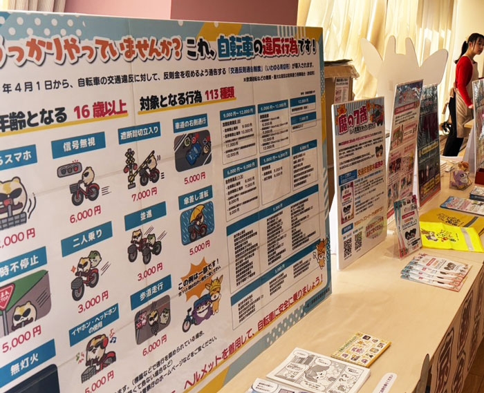 このイベントでブースを設置して、自転車の運転マナーや交通ルールについてや来年春からの交通ルール改正についての啓発を行いました。