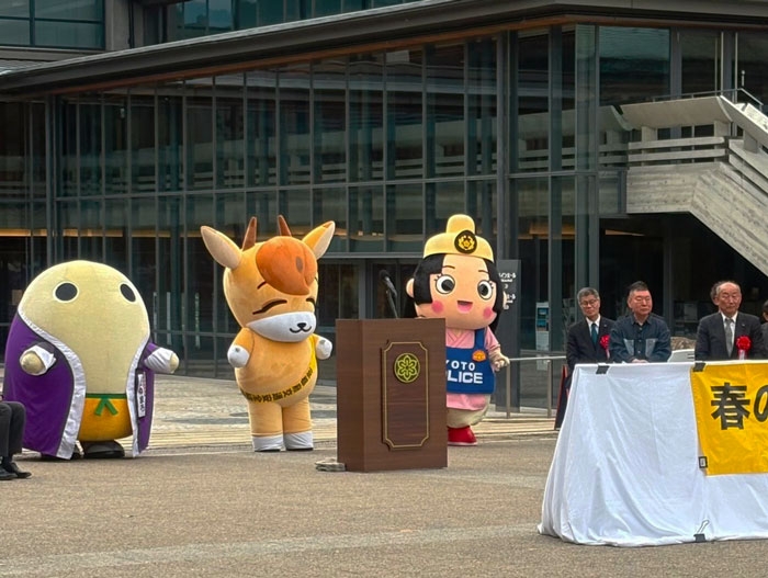 式典には、当協会のマスコットキャラクターコンちゃん・京都府広報監まゆまろ・ポリスみやこの3人も参加して、皆さんと一緒に「春の全国交通安全運動」の開始と安全運転をアピールしました。