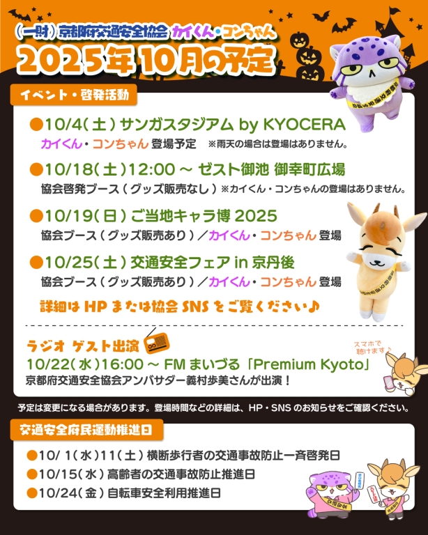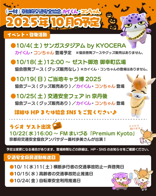詳細はこちら10/22(水)16:00~FMまいづる「Premium Kyoto」当協会アンバサダーの義村歩美さんが出演✨協会の活動やイベントについてお話しします♪★カイくん・コンちゃん関連★10/1(水)17:00頃公式X(旧ツイッター)で10月カレンダー壁紙配布✨