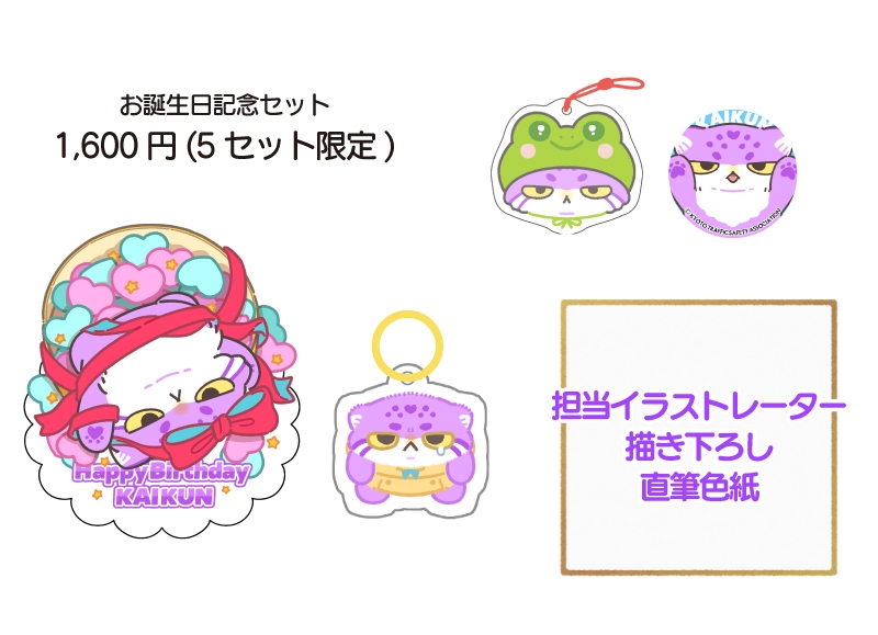 【セット内容 各1個】お誕生日記念アクリルスタンド/めじるしアクリルチャーム(ベビーver)/32mm缶バッジ/カイくん無事カエル反射チャーム/担当イラストレーター描き下ろし直筆ミニ色紙