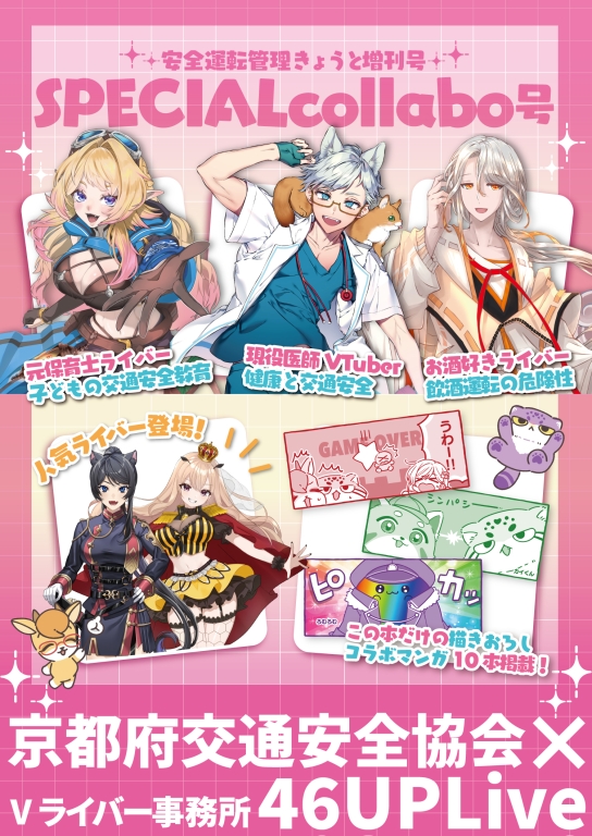 この度、京都府交通安全協会では、当協会の発行する機関誌「安全運転管理きょうと」の増刊号として、Vライバー事務所「46UPLive」様とのスペシャルコラボ号を制作しました✨