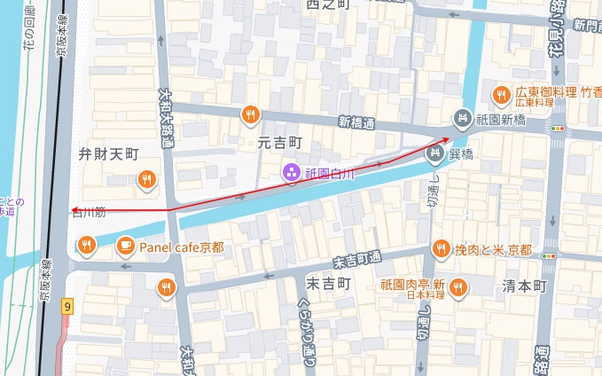 白川筋は、川端通から新橋通まで、東西に通る約200mの小道です。